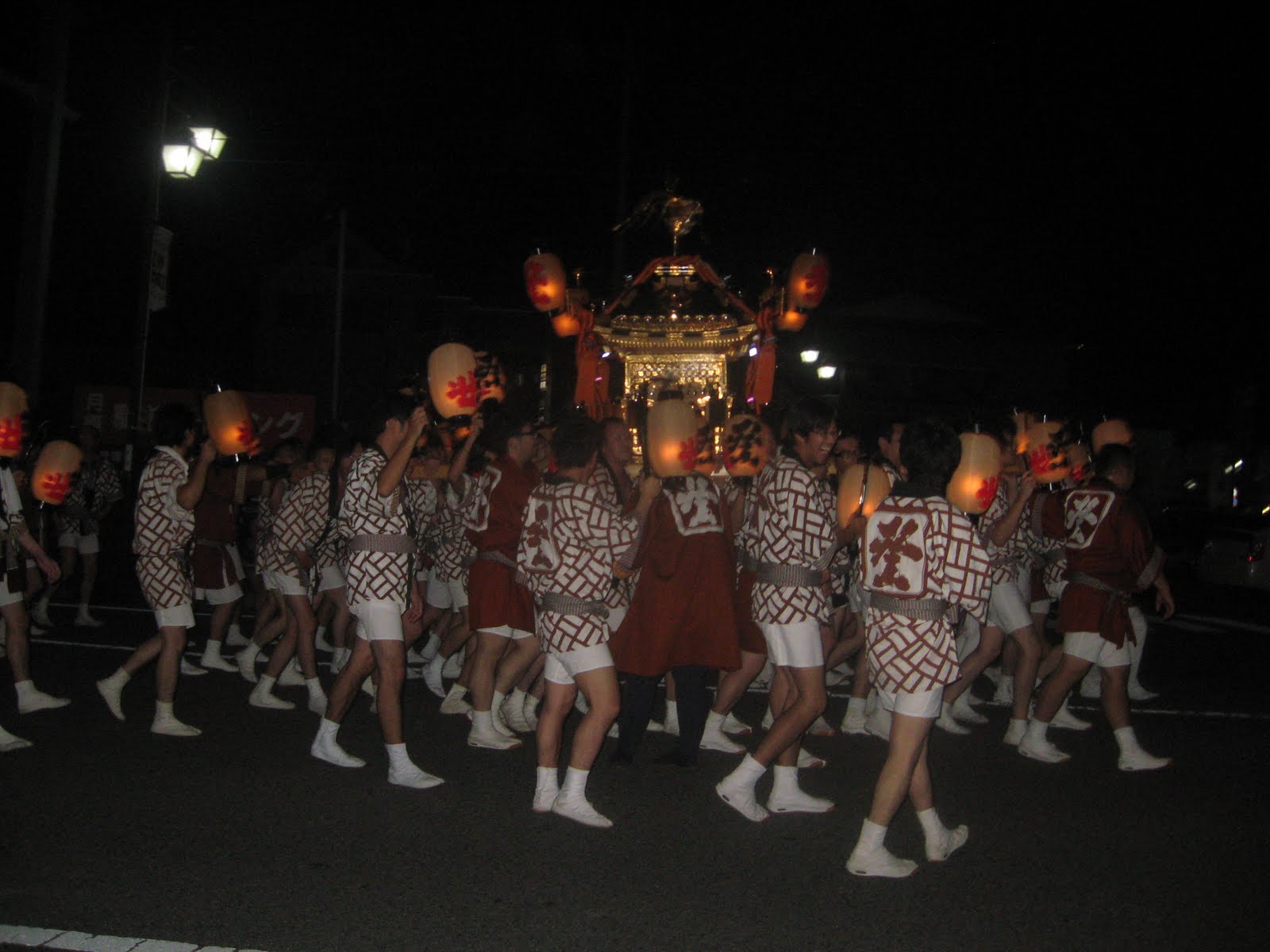 The Chochin Matsuri is a Shinto religion festival and groups of men (and sometimes women) will carry Shinto shrines on their backs throughout the town to honor the spirits of the dead. I lost count at how many different groups carried shrines and they looked so heavy. When one group would get to an intersection (me and my host mom got a good spot) they would start dancing, I guess that’s what you can call it, while still carrying the shrine. Man, it was so cool! Not all of the groups carried shrines though and people of a wide arrange of ages participated in the parade. Different groups carried different sized lanterns as well as these lanterns on GIANT poles. They were huge! It took like at least two people to carry one of these poles with lanterns on top and to make their jobs more challenging; they had power lines to maneuver through. Another part of the parade was all of the local Shinto priests marched through the streets, holding small lanterns, while these two men dressed up as famous Shinto spirits. The “spirits” danced around and put on quite the show. However, as a respect to their religion, my host mom told me not to take any pictures of the portion of the parade when the priests and “spirits” passed by. So far, it’s been in my top five of the coolest things I have ever seen here in Japan.